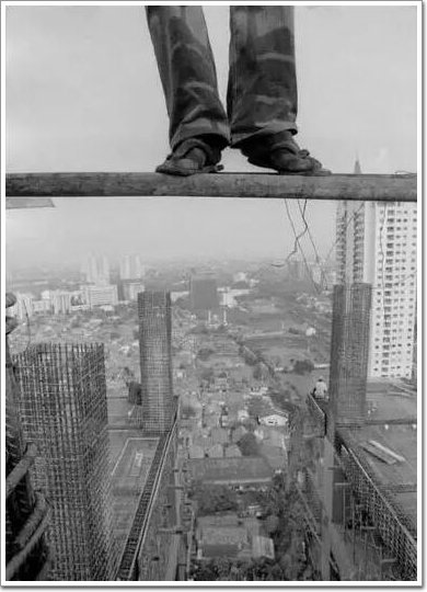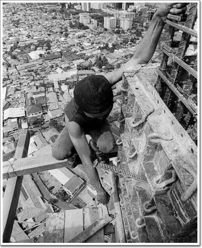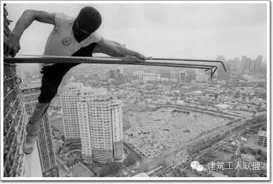 工人站在不足一腳寬的方木上,一只手抓著鋼筋,一只手在進行工作,下面是幾十米的高空和遠處的城市背景!