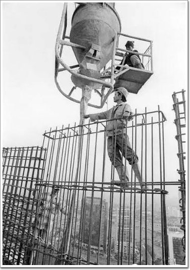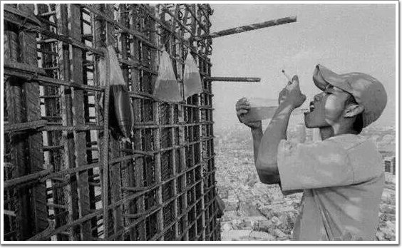 在高空綁鋼筋的建筑工人,一只腳只是踩著一根支出去的鋼筋,很明顯的沒有帶安全帶,看著著實危險。