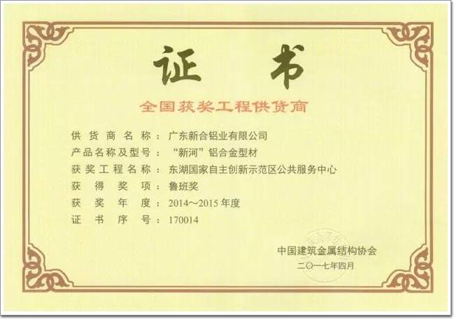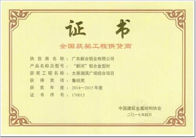中國建設(shè)金屬結(jié)構(gòu)協(xié)會于2017年4月向新河頒發(fā)兩項“魯班獎(詞條“魯班獎”由行業(yè)大百科提供)全國獲獎工程供應(yīng)商”證書。由公司供應(yīng)鋁型材產(chǎn)品的工程項目:東湖國家自主創(chuàng)新示范區(qū)公共服務(wù)中心項目、太原湖濱廣場綜合項目榮獲國內(nèi)建筑行業(yè)工程質(zhì)量最高榮譽(yù)獎——“中國建設(shè)工程魯班獎(國家優(yōu)質(zhì)工程)”(簡稱“魯班獎”),這是對新河鋁材高品質(zhì)的又一次充分肯定。自此,新河鋁材目前已擁有四項“魯班獎獲獎工程供應(yīng)商”證書,是鋁材行業(yè)獲此殊榮最多的企業(yè)之一,展現(xiàn)了新河鋁材在建筑工程領(lǐng)域的雄厚實(shí)力。