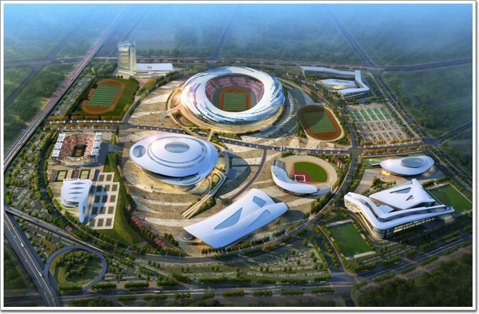 該項目不同于傳統體育建筑群軸線對稱的靜態設計理念,體育中心項目以體育場和體育館為核心,以貫通體育館和體育場的“S”形平臺為主脈,其他場館及附屬設施為輔脈,形成了一個流動的構圖,體現了“運動之脈”的主題。體育中心場館眾多,包括體育場、體育館、網球場、室內網球訓練館、游泳館、棒球場、綜合訓練館、室內田徑館、教育科研樓、媒體中心十大單體場館。另外,還包括足球、籃球、網球、棒球等運動訓練場地、停車場等配套設施。