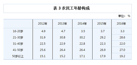 農(nóng)民工仍以青壯年為主,但所占比重繼續(xù)下降,農(nóng)民工平均年齡不斷提高。從平均年齡看,2016年農(nóng)民工平均年齡為39歲,比上年提高0.4歲。從年齡結(jié)構(gòu)看,40歲以下農(nóng)民工所占比重為53.9%,比上年下降1.3個(gè)百分點(diǎn);50歲以上農(nóng)民工所占比重為19.2%,比上年提高1.3個(gè)百分點(diǎn)。