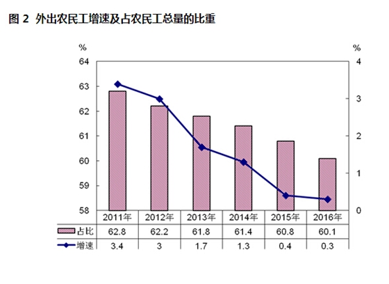 2011-2016年,外出農(nóng)民工增速呈逐年回落趨勢,增速分別為3.4%、3%、1.7%、1.3%、0.4%和0.3%。外出農(nóng)民工占農(nóng)民工總量的比重也由2011年的62.8%逐漸下降到2016年的60.1%。