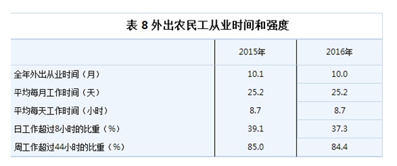 農(nóng)民工年從業(yè)時(shí)間平均為10個(gè)月,月從業(yè)時(shí)間平均為24.9天,日從業(yè)時(shí)間平均為8.5個(gè)小時(shí),均與上年持平。日從業(yè)時(shí)間超過8小時(shí)的農(nóng)民工占64.4%,周從業(yè)時(shí)間超過44小時(shí)的農(nóng)民工占78.4%,分別比上年下降0.4 和1個(gè)百分點(diǎn)。其中,外出農(nóng)民工日工作超過8小時(shí)和周工作超過44小時(shí)的比重比上年分別下降1.8和0.6個(gè)百分點(diǎn),超時(shí)勞動(dòng)情況改善比較明顯。