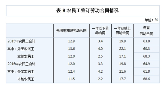 2016年與雇主或單位簽訂了勞動(dòng)合同的農(nóng)民工比重為35.1%,比上年下降1.1個(gè)百分點(diǎn)。其中,外出農(nóng)民工與雇主或單位簽訂勞動(dòng)合同的比重為38.2%,比上年下降1.5個(gè)百分點(diǎn);本地農(nóng)民工與雇主或單位簽訂勞動(dòng)合同的比重為31.4%,比上年下降0.3個(gè)百分點(diǎn)。