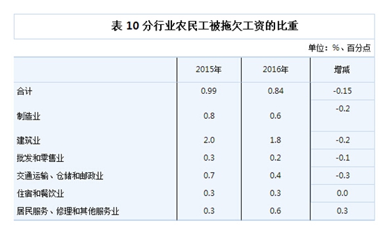 從農(nóng)民工比較集中的幾個(gè)行業(yè)看,2016年制造業(yè)、建筑業(yè)、批發(fā)和零售業(yè)、交通運(yùn)輸倉儲(chǔ)和郵政業(yè)被拖欠工資的農(nóng)民工比重分別為0.6%、1.8%、0.2%和0.4%,分別比上年下降0.2、0.2、0.1和0.3個(gè)百分點(diǎn)。居民服務(wù)、修理和其他服務(wù)業(yè)被拖欠工資的農(nóng)民工比重有所上升,2016年為0.6%,較上年上升0.3個(gè)百分點(diǎn)。