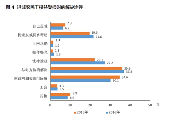 在工作和生活中遇到困難時(shí),62.4%的進(jìn)城農(nóng)民工想到的是找家人、親戚幫忙,找老鄉(xiāng)的占28.9%,找本地朋友的占24.7%,找單位領(lǐng)導(dǎo)或同事的占11.7%,找工會(huì)、婦聯(lián)和政府部門的占6.8%,找社區(qū)的占2.3%。找家人、親戚幫忙,找老鄉(xiāng)和找本地朋友幫忙的農(nóng)民工比重分別比上年提高0.7、1.1和1.4個(gè)百分點(diǎn)。當(dāng)權(quán)益受損時(shí),進(jìn)城農(nóng)民工選擇解決途徑依次是:36.8%與對方協(xié)商解決,比上年提高0.9個(gè)百分點(diǎn);30.1%向政府相關(guān)部門反映,比上年下降4.5個(gè)百分點(diǎn);27.2%通過法律途徑解決,比上年提高5.1個(gè)百分點(diǎn)。
