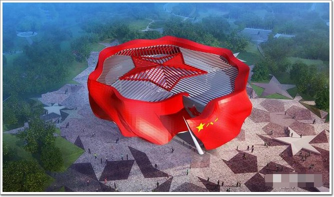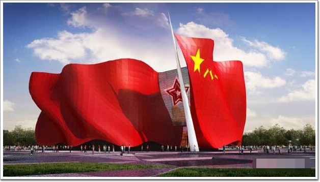 展示館外形由一面飄揚的紅色軍旗卷起而成,給人以全新的視覺沖擊,配合著一架架軍事裝備,紅色的英雄情結躍然而出。輕武器展示館建筑面積達4300平方米,實際上,紅色的軍旗是由8100塊三角鋁板幕墻組成,幕墻上部檐口(詞條“檐口”由行業大百科提供)為波浪起伏,幕墻總面積達8600平方米,通過三維坐標定點安裝成一面長286米,高24-26米,旗桿高度29.3米迎風飄揚的旗子。