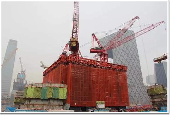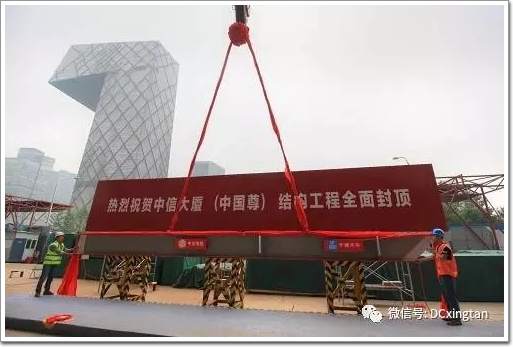 ▲2015年3月中國尊大廈項目主塔樓智能頂升鋼平臺體系安裝完成。該體系為世界房建施工領域最重、面積最大、承載力最高、世界首次與大型塔吊一體化結合的鋼平臺體系。