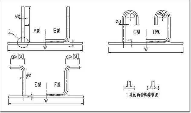 (3)爪形埋件中A、B兩型錨筋宜采用螺紋鋼。C、D型的錨筋在設(shè)計時應(yīng)考慮錨筋間的干涉及錨筋在安裝時與結(jié)構(gòu)配筋之間的干涉問題。E、F型埋件適合于需要進行防雷的部位。