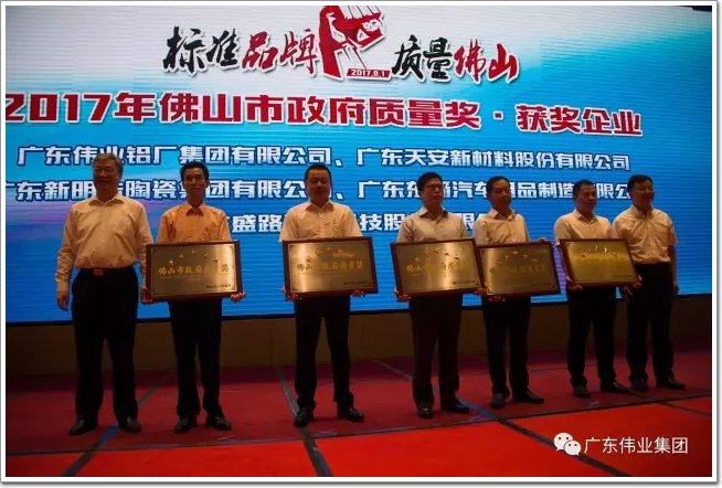 大會上,市領導通報2017年佛山市政府質量獎文件,廣東偉業鋁廠集團有限公司作為鋁型材行業唯一一家與廣東天安新材料股份有限公司、廣東東箭汽車用品制造有限公司、廣東新明珠陶瓷集團有限公司、廣東盛路通信科技股份有限公司等5家企業捧回大獎。