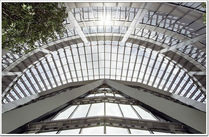 建筑整體外立面采用深藍色玻璃幕墻,銀灰色米字形外筐架,整個大廈成弧形,更擴大了采光面,看起來端莊別致,自有一種氣勢,引人注目。在建筑向內(nèi)凹一側(cè)的立面上,玻璃幕墻被向外拉拽,形成一系列中庭,縱貫整個建筑。這些空間作為氣候緩衝區(qū),對建筑起到絕熱作用,有助于大幅度降低建筑能耗。鑒于各樓層的面積都以滿足一個完整的業(yè)務(wù)單元的需要而確定,有必要加強公司間的協(xié)作,為辦公空間營造出一個社交維度。