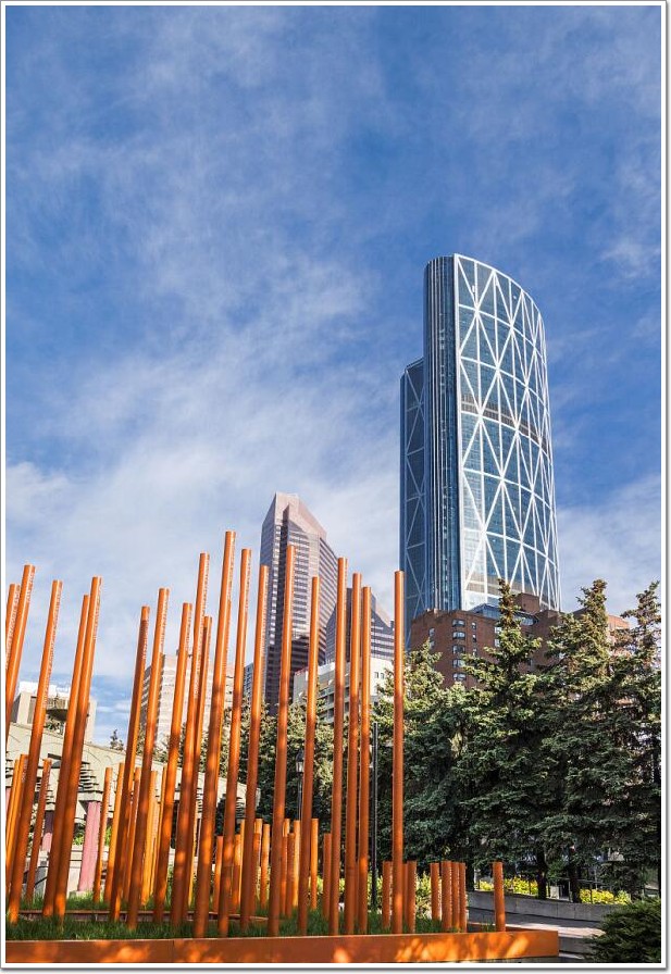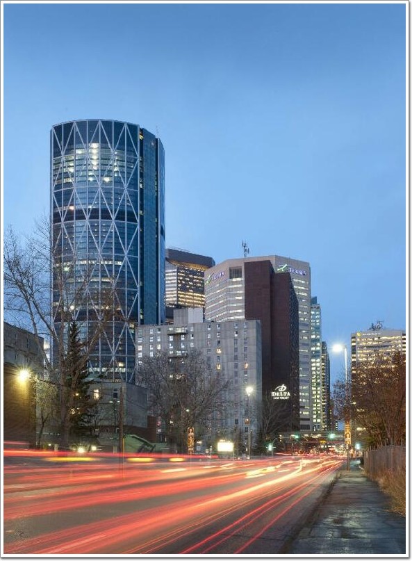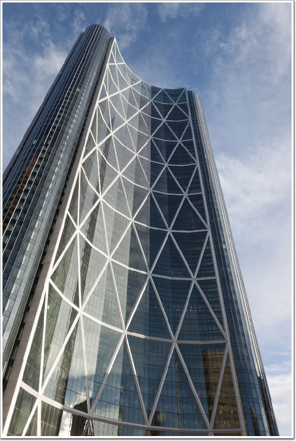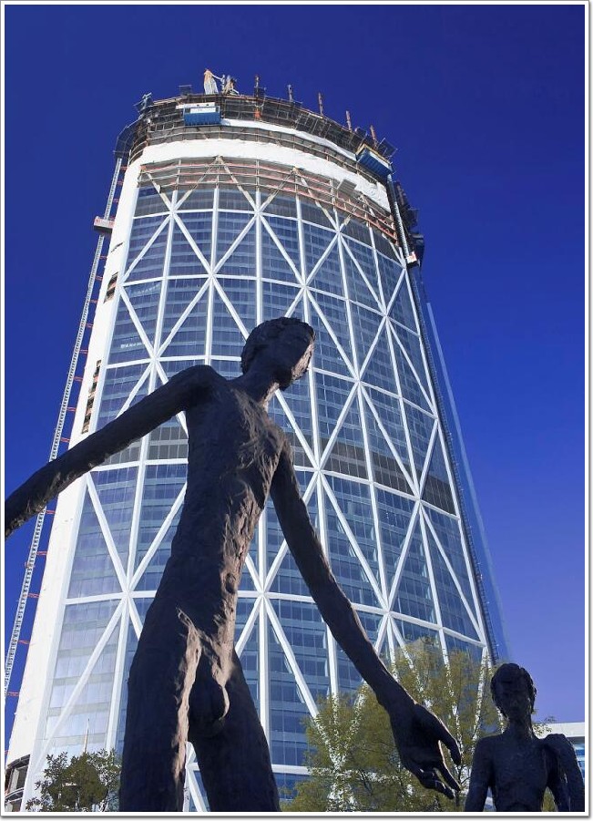 “弓塔”位于卡爾加里市中心,于2011年開工建設(shè),于2013年竣工投用,總建筑面積19.98萬平方米,該塔共59層,總高度237米,目前仍是加拿大西部的最高建筑,更是城市天際線上一處醒目的新地標(biāo),該建筑被譽為世界上最壯觀的企業(yè)建筑之一,還曾被碧空雜志Azure Magazine 評為2012年十大頂級建筑。大廈擁有15萬8千平方米辦公空間,主要為EnCana公司和Cenovus能源兩大石油和天燃氣巨頭總部共享。
