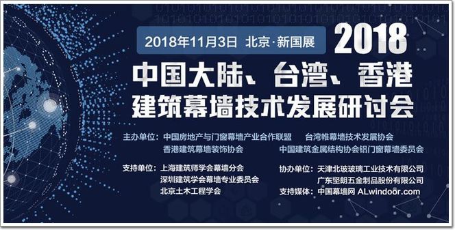 2018年11月3日,由中國房地產(chǎn)與門窗幕墻產(chǎn)業(yè)合作聯(lián)盟發(fā)起,臺灣帷幕墻技術(shù)發(fā)展協(xié)會、香港建筑幕墻裝飾協(xié)會、中國建筑金屬結(jié)構(gòu)協(xié)會鋁門窗幕墻委員會主辦,北京土木工程學(xué)會、上海建筑師學(xué)會幕墻分會、深圳建筑學(xué)會幕墻專業(yè)委員會、蘇州市建筑金屬結(jié)構(gòu)協(xié)會支持,天津北玻玻璃工業(yè)技術(shù)有限公司、廣東堅朗五金制品股份有限公司協(xié)辦的“2018年中國大陸、臺灣、香港建筑幕墻技術(shù)發(fā)展研討會”在北京新國際展覽館W201會議室隆重舉行。中國幕墻網(wǎng)ALwindoor.com 作為特約媒體對本次會議進(jìn)行了全程報道。