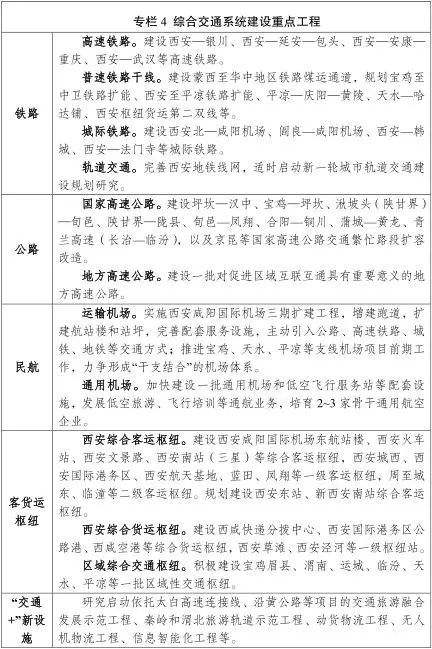 綜合交通樞紐:渭南、商洛、運城、臨汾、天水、平涼等一批區域性交通樞紐建設,西安咸陽機場國際航空樞紐建設,啟動寶雞、天水、平涼、華山等民用支線機場項目前期工作。