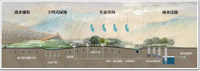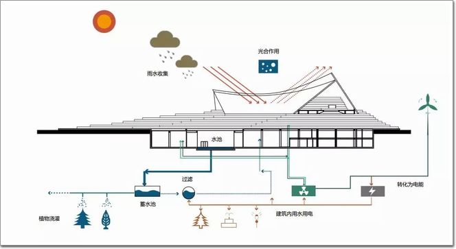 屋頂設雨水收集系統,場地采用透水鋪裝,地下設雨水調蓄池。經過處理的雨水用于梯田滴灌,形成生態微循環,改善區域微氣候。