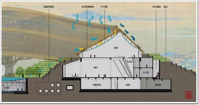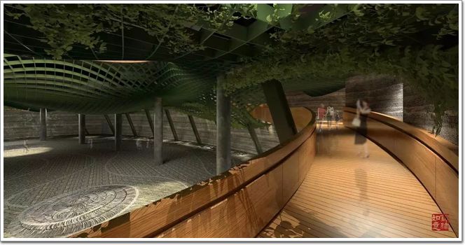 ——建筑整體呈“C”形,圍繞出圓形的前廣場,為游客留出充足的集散空間。當人們走近中國館的時候,不必擔心排隊入館的枯燥和暴曬,沿著與天對話的一池凈水,穿過蔥蘢的樹蔭,身邊是五彩梯田,仿佛一步步走進自然的客廳。