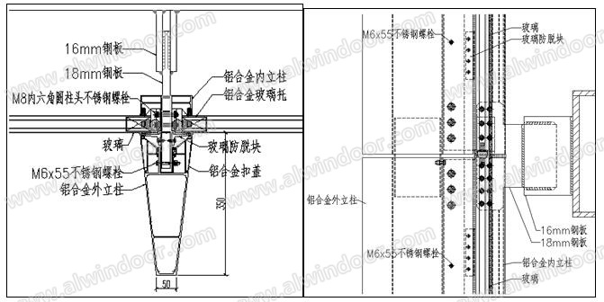 立面框架玻璃幕墻鋁合金立柱分為內、外兩部分,內、外鋁立柱通過布置的不銹鋼螺栓緊密配合達到協同受力的目的,承受垂直于玻璃面的荷載。鋁合金內立柱通過“二夾一鋼板”與主體鋼結構連接。兩塊16mm厚鋼板連接件與主體鋼結構焊接,一塊18mm鋼板連接件與鋁立柱用多顆M8不銹鋼螺栓連接,16mm鋼連接件與18mm鋼連接件相互配搭、焊接,以適應主體鋼結構產生的誤差(見圖3、圖4)。