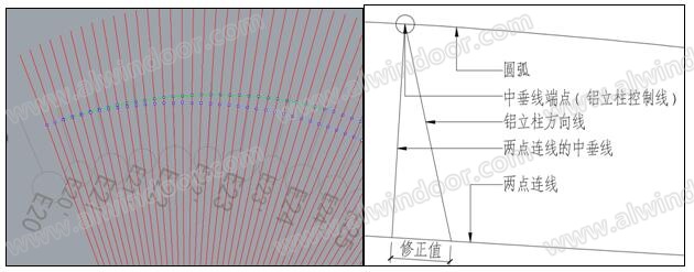 主體鋼結構移交后工作面條件十分有限,而且施工現場沒有其他可以利用的輔助結構。因此很難通過全站儀測點、然后做標記的方法進行精準的打點放線。經過多次研究討論,最終采用“圓弧兩點連線,中垂線取拱高”的方法進行放線。具體方法是:(1)取相鄰軸線位置鋁立柱控制線同一標高的點,兩點連線,根據模型中理論尺寸當作連線的中垂線確定圓弧拱高,中垂線的端點即為鋁立柱控制點。利用圓弧與變化曲面的偏差值對鋁立柱的方向進行修正(見圖10、圖11)。然后將鋁立柱落位,點焊固定。立柱安裝完成后用全站儀對復測點進行檢查,結合拉尺校核相鄰鋁立柱之間的凈空。