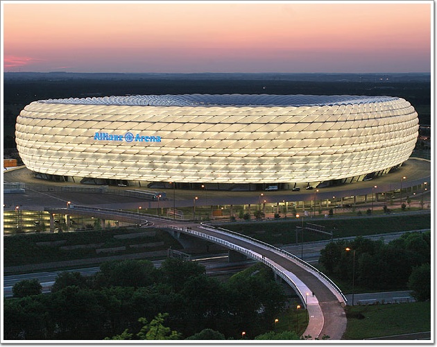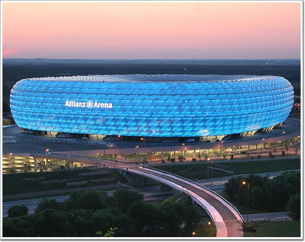 該球場最為特別的是,即使不看比賽前的賽事預(yù)告,只要站在能看到安聯(lián)球場的地方就能知道是哪支球隊(duì)正在比賽,甚至還能知道主隊(duì)有沒有贏球,這就是安聯(lián)球場的獨(dú)特之處。它的奧秘全在球場的外皮上,這不同尋常的表皮由2874個(gè)ETFE菱形膜結(jié)構(gòu)構(gòu)成,而在這2874個(gè)膜結(jié)構(gòu)中有1056個(gè)可以發(fā)光,當(dāng)場館內(nèi)有比賽時(shí),整個(gè)球場的照明系統(tǒng)將場館映射成一個(gè)紅色的發(fā)光體,被照成紅、藍(lán)、白三色,分別對應(yīng)拜仁、慕尼黑1860以及德國國家隊(duì)的隊(duì)服顏色,整個(gè)球場顯得現(xiàn)代感十足,同時(shí)也給人強(qiáng)烈的視覺沖擊,并賦予整個(gè)建筑一種幾近魔幻般的意境。
