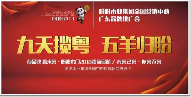 2017年末,“九天攬粵·五羊歸盼”盼盼“有品牌·贏未來”盼盼木門2018招商計劃正式啟動,看其主題,就能輕易看出盼盼的2018發展大計——招商!尤其是攻下廣東市場,甚至華南市場,以擴大事業版圖。