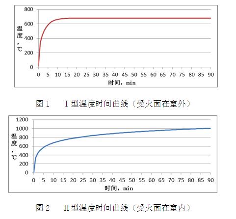 現(xiàn)在暫無完全適用的、現(xiàn)行的建筑外窗耐火完整性檢測判定標(biāo)準(zhǔn)。目前國家標(biāo)準(zhǔn)《建筑門窗耐火完整性試驗(yàn)方法及判定要求》正在報(bào)批中。充分考慮受火面的問題(室內(nèi)側(cè)受火還是室外側(cè)受火),因此確定了兩條溫度-時(shí)間曲線,其中Ⅰ型曲線適用模擬室外側(cè)受火,Ⅱ型曲線適用于模擬室內(nèi)側(cè)受火。