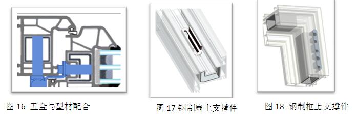 通過五金支撐件將五金與鋼襯“穿過”型材,直接相連,來解決連接部位不耐高溫的問題。(如圖16-圖18)