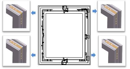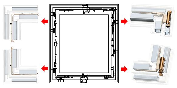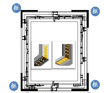 b.通過在扇和框的角部安裝“L”形五金,將兩個(gè)方向的鋼襯連接在一起,促使整扇形成一個(gè)可靠的框架,保證框架的整體穩(wěn)定性。框上的方案示意參考圖19,扇上的方案示意圖如