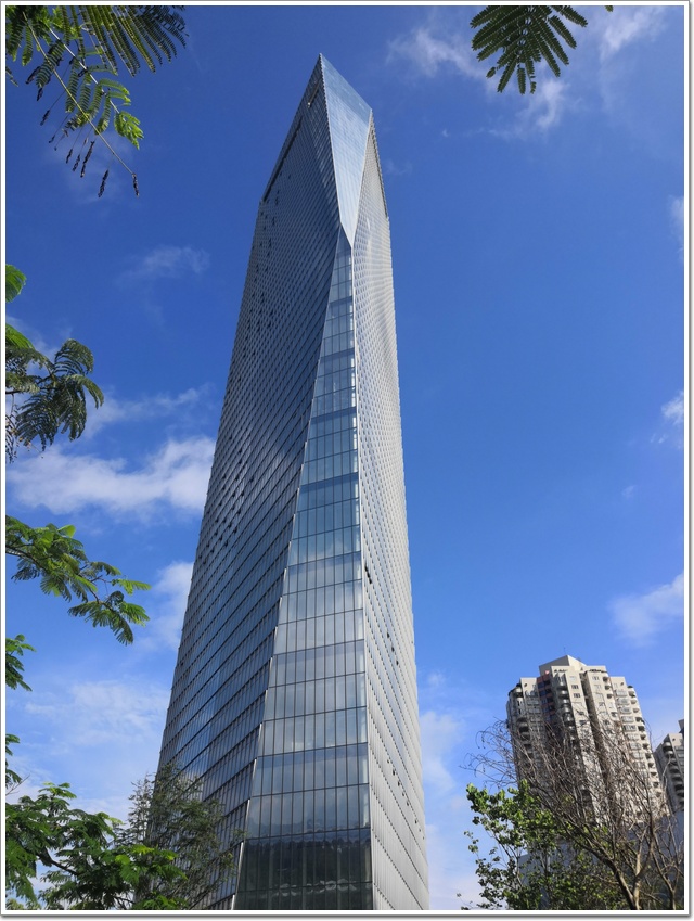 建筑特色:項目整體設計由美國KPF建筑事務所操刀,由中建三局南方公司承建,據悉,該項目巨柱傾斜角度達12.85度,屬國內傾斜角度最大、施工難度最大的超高層外框巨柱。建筑整體外形呈現如切割的鉆石,造型獨特,棱角分明,該塔樓的整體設計是以日照來決定其形體的,高性能立面面朝城市軸線與深圳灣,避開住宅區。