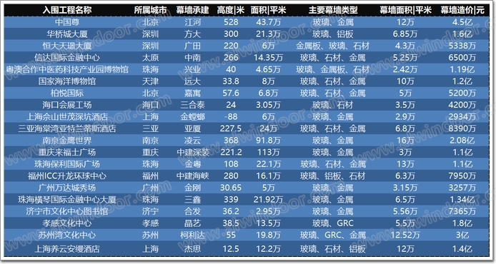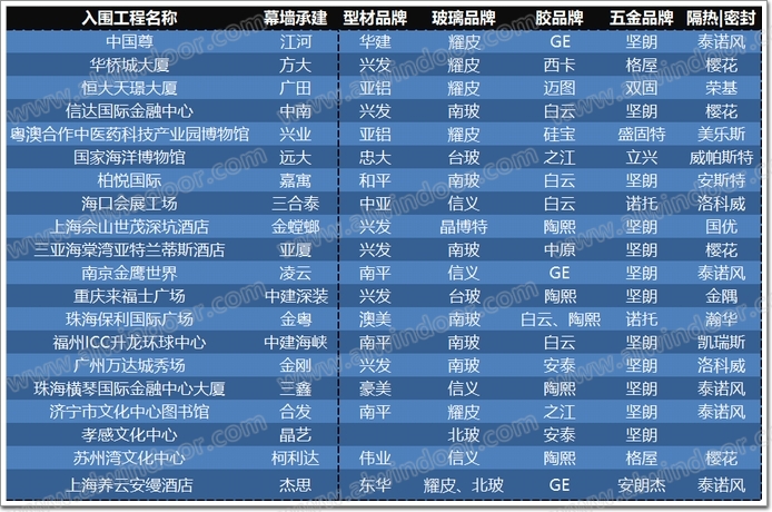通過上面這張工程信息表我們可以發現,本年度入圍的幕墻工程項目,所選用的建筑型材、玻璃、五金、建筑膠、隔熱條、密封膠條等,均為中國門窗幕墻行業“首選品牌”上榜產品,品牌度高、質量上成的材料供應商,得到廣大業主、設計院以及工程企業大型工程或地標項目中高度的認可,著實令人欣喜。