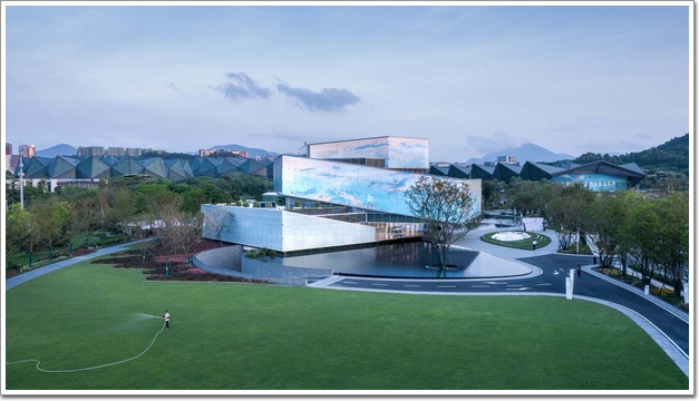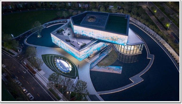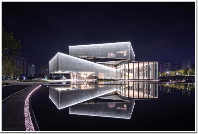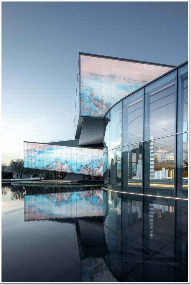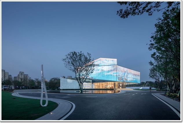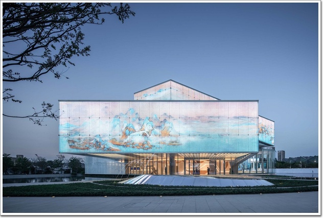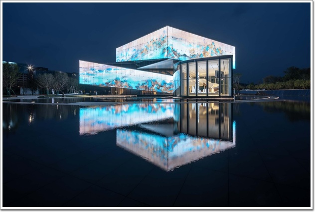 白天,陽光下的點釉玻璃呈現宣紙般朦朧雅致的純凈氣質,平和而典雅,黃昏,夕陽的余暉灑落在畫卷之上,建筑與天色共璀璨,夜幕降臨,氣勢磅礴的動態山水長卷旋繞建筑周圈,恢弘而激蕩,夜深人靜之際,溫和的泛光模式使建筑歸隱自然,靜謐祥和。