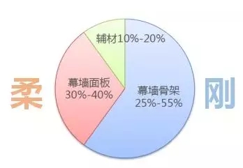 建筑幕墻工程的幕墻材料(詞條“幕墻材料”由行業大百科提供)是如何組成的呢?幕墻面板成本占幕墻總材料成本的30%-40%,幕墻骨架成本占幕墻總材料成本的25%-55%,幕墻輔材成本占幕墻總材料成本的10%-20%。下圖為建筑幕墻工程材料成本比例圖,從幕墻材料組成形式我們可以清楚了解到材料的分配比例,材料可根據不同特點劃分為柔性成本和剛性成本: