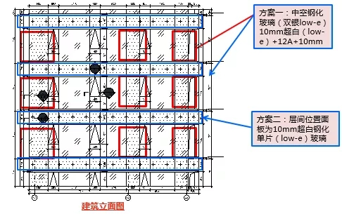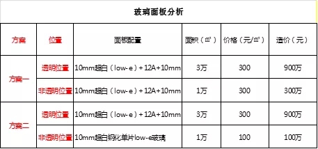 優化方案二:玻璃幕墻系統非透光部位玻璃由中空鋼化玻璃(雙銀low-e)10mm超白(low-e)+12A+10mm修改為10mm超白鋼化單片low-e玻璃。