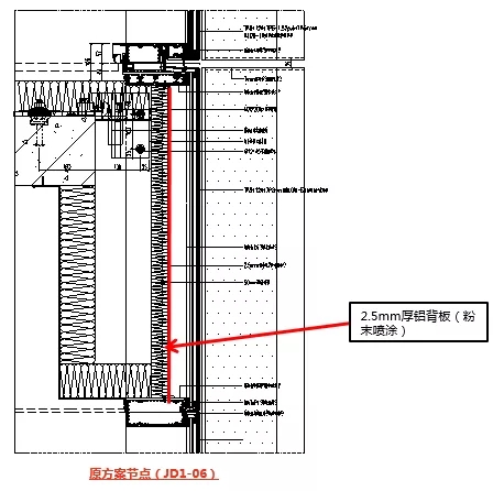 原方案一:玻璃幕墻層間非透光部位采用2.5mm厚鋁背板(粉末噴涂(詞條“粉末噴涂”由行業大百科提供))