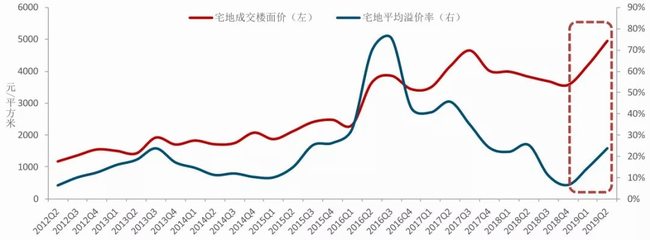 圖:2012-2019年二季度全國300個城市住宅用地成交樓面均價及平均溢價率