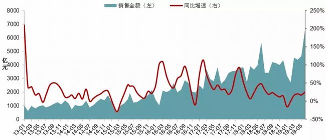 圖:2013年至2019年上半年代表企業月度銷售額及同比增速