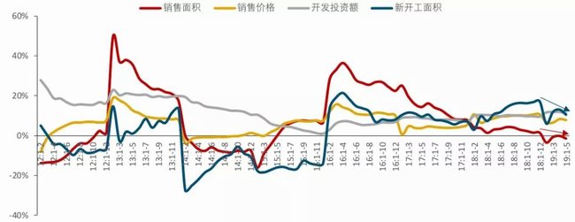 圖:2012年至今全國商品房銷售面積、銷售價格、開發投資額、新開工面積同比走勢