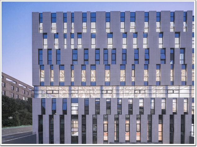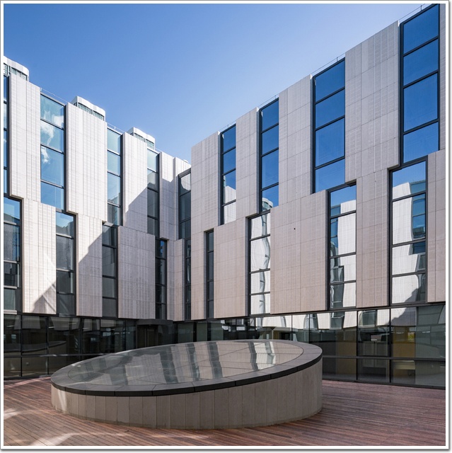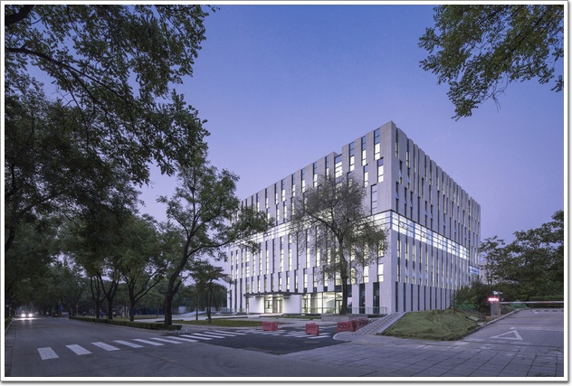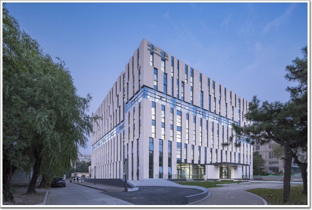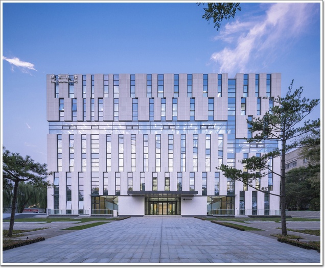 在建筑內部方面,挑空的空間主題在室外依然有延續。更為特別的是,閱覽和研究區旁連續的一扇扇窗呈錐形對角狀,為建筑中部三層增添了透明的質感,效果十分靈動。而外立面的石材覆層呈垂直條狀,與玻璃交錯搭配,仿佛是中國經典的竹卷書簡,設計與空間的功能相契合,建筑整體會令人聯想到傳統的雕版印刷和印章,這些與書籍、秩序和法律緊密相連的形象。而建筑周圍的空間虛實相映,讓人一下就聯想到北京特色——迷宮般大大小小的胡同,特別是那些掩藏在墻和門之后的傳統庭院,鏤空的空間也呼應出周邊建筑的特色——天井。