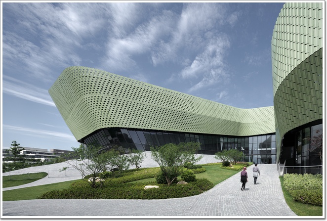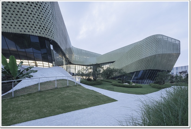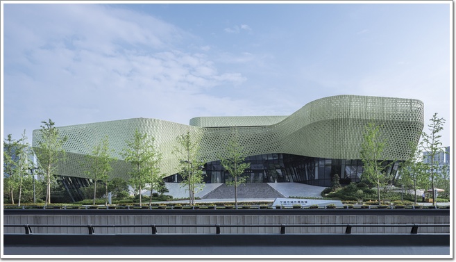 項目整體造型靈感源自中國漢代逐漸興起的彩帶舞,賦予了建筑自由流動的造型。建筑立面形式復雜,包括主要表皮陶片、內幕墻、可開啟窗、消防救援窗、百葉窗的定位等,“像素化”排列陶板安裝工程需要精準定位,是該項目的難點之一,而陶片的運用,正是對寧波青瓷文化的延續和發揚,形成了獨特的立面質感和肌理。