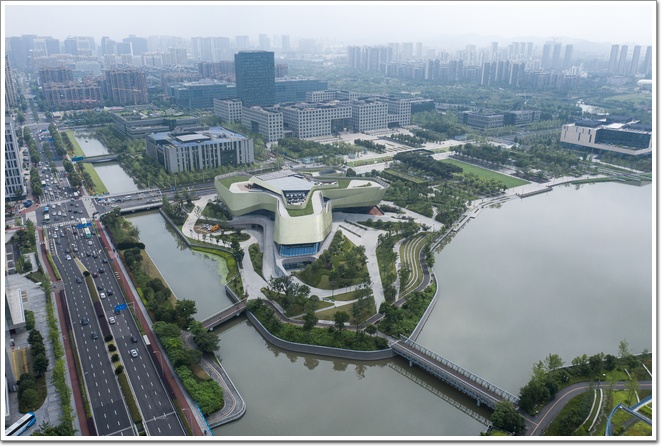 為了強調展覽館作為公共場所的作用,Playze和Schmidhuber將建筑作為周邊濱水景觀的延續,因此建筑也是公共公園的一部分。小徑、橋梁和街道編織成通向建筑物多個入口的景觀,從而模糊了公園和建筑之間的界限。寧波市擁有悠久的陶瓷生產歷史,所謂的陶瓷之路就是從這里開始的。縱觀整個文明史,這座城市在國內和國際貿易中扮演著重要的角色。