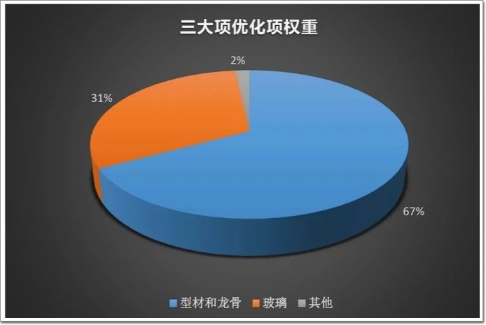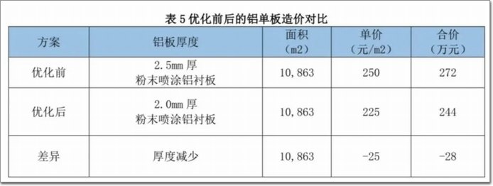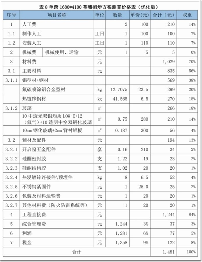 綜上分析,經過對幕墻結構、玻璃及細部的優化,在滿足功能及立面效果的基礎上,大大節約了造價,優化比例達到24%,其中型材和龍骨的優化節省金額占比67%,是主要優化內容。見下表6。