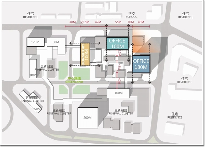 超越紅線—統(tǒng)籌更新遠(yuǎn)處山景:板式宿舍垂直山體布置,所有房間均能獲得雙向山景視野。北側(cè)學(xué)校:三棟塔樓保證合理間距,讓出日照通廊,減少對(duì)學(xué)校遮擋。南側(cè)遮擋:主塔錯(cuò)讓南側(cè)地塊200米塔樓,板樓退讓南側(cè)板樓。