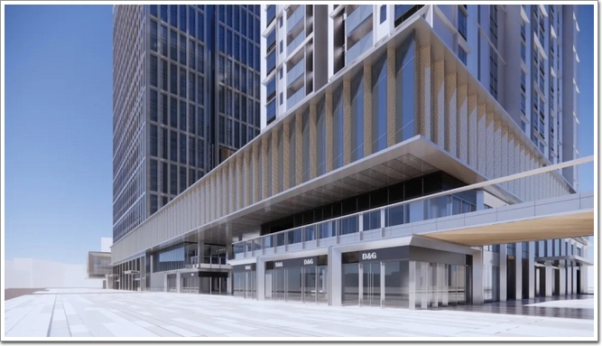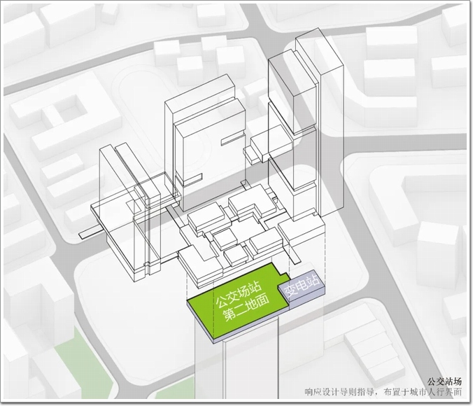 將公交場(chǎng)站及市政變電站布置于城市次要界面,減少影響,并充分利用城市基礎(chǔ)設(shè)施形成的“第二地表”,與其共構(gòu)形成商業(yè)聚落。
