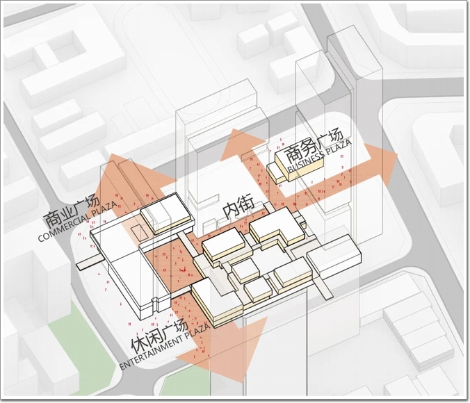 在三個(gè)街角退讓形成公共開(kāi)放空間,在廣場(chǎng)間形成“T”型內(nèi)部的活力街區(qū)。