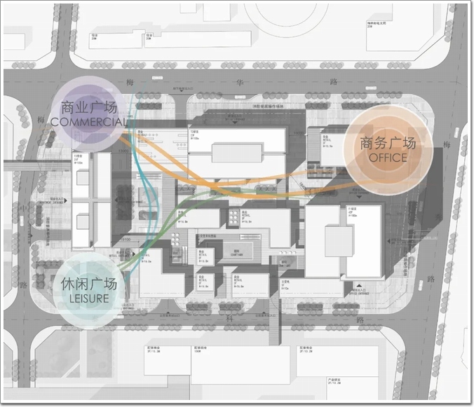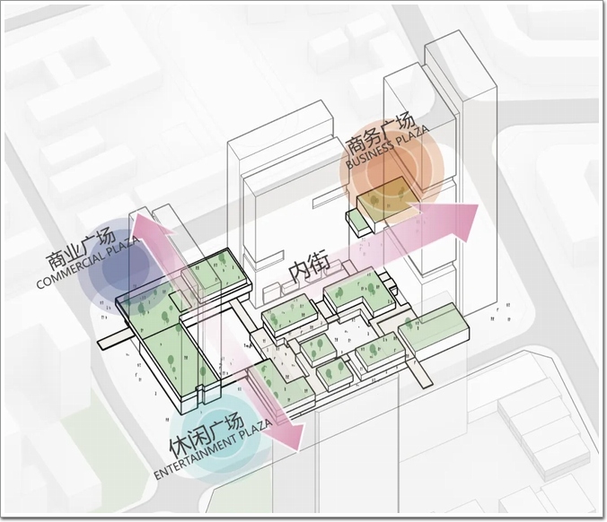 東北——商務(wù)廣場(chǎng),雙辦公圍合,塑造形象與吸引的入口商務(wù)廣場(chǎng);西南——休閑廣場(chǎng),由宿舍+商業(yè)+創(chuàng)意聚落圍合形成休閑活動(dòng)廣場(chǎng);西北——商業(yè)廣場(chǎng),營(yíng)造有頂蓋的商業(yè)入口廣場(chǎng)。