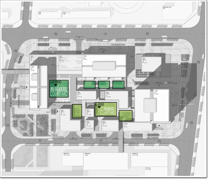 兩組庭院、兩種氛圍:首層主廣場(chǎng)庭院2200m²,以商業(yè)活動(dòng)為主;二層創(chuàng)意庭院分別為500m²,900㎡,600m²以創(chuàng)意交流為主,在不同標(biāo)高,一動(dòng)一靜,交往聚集。