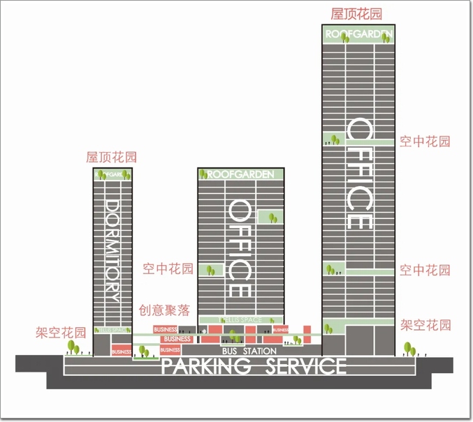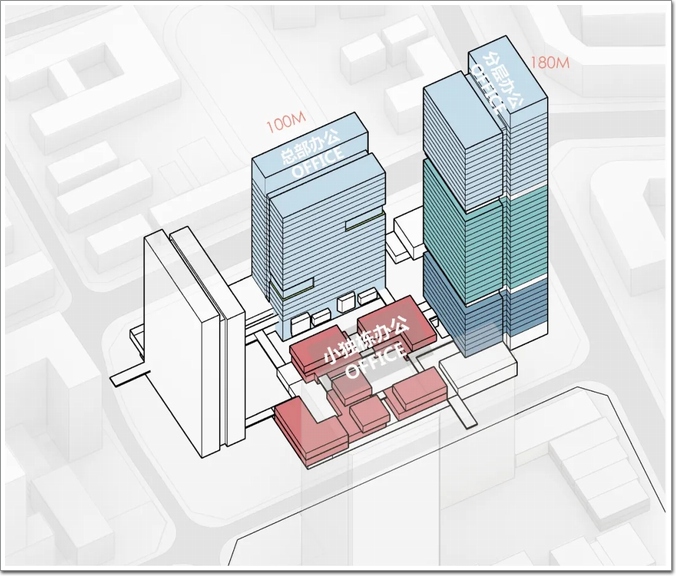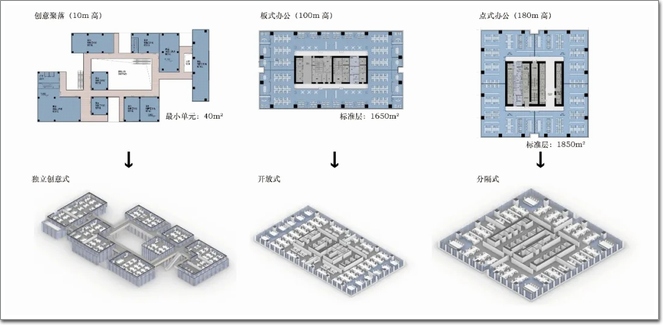 設(shè)計(jì)希望為入住研發(fā)企業(yè)和新型小微企業(yè)創(chuàng)造多元辦公尺度并存、空間混合、滿足不同使用人群和未來(lái)多元產(chǎn)業(yè)模式的三維立體園區(qū),包含:180m主塔樓分層辦公、100米板式整棟總部開(kāi)放式辦公、聚落型獨(dú)立式辦公。