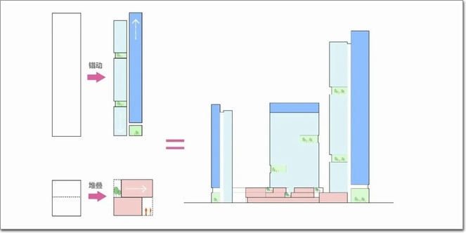 空間與盒子:讓不同尺度的功能空間在體量上有“可視性”,以期達(dá)到功能與形態(tài)的統(tǒng)一、可識(shí)別。錯(cuò)動(dòng)與堆疊:強(qiáng)調(diào)體塊的穿插錯(cuò)動(dòng),通過(guò)塔樓大體塊堆疊,創(chuàng)意聚落小體塊錯(cuò)動(dòng),創(chuàng)造豐富的空間體驗(yàn)和尺度表達(dá)。