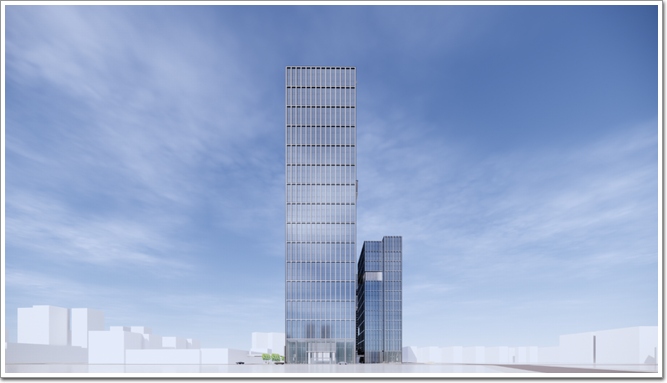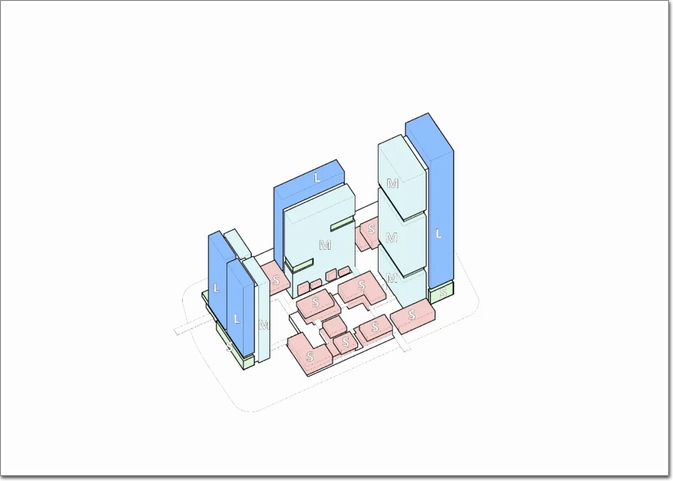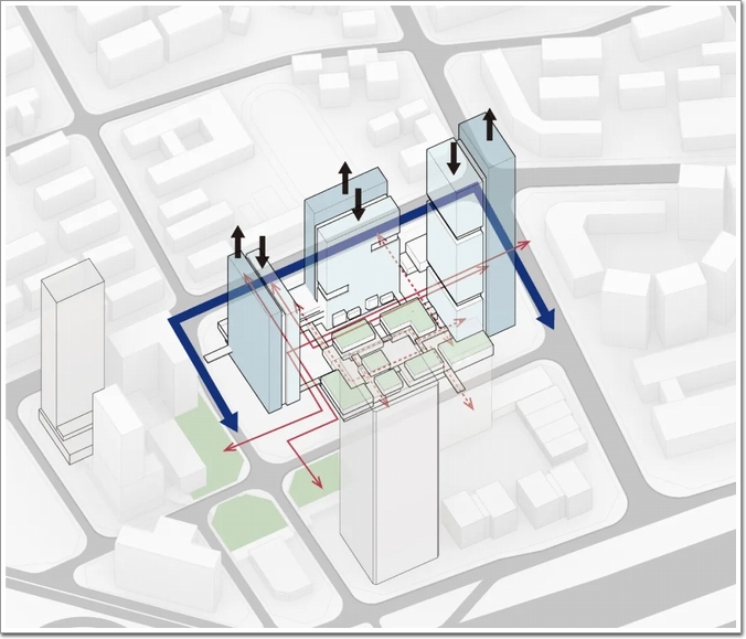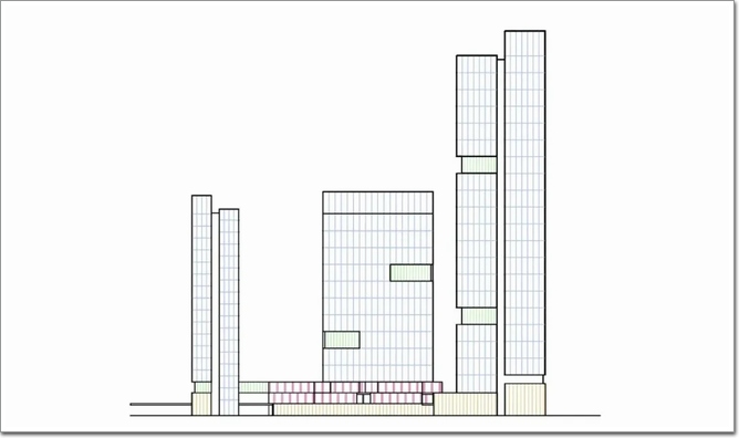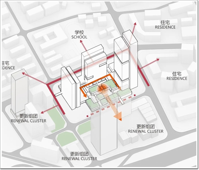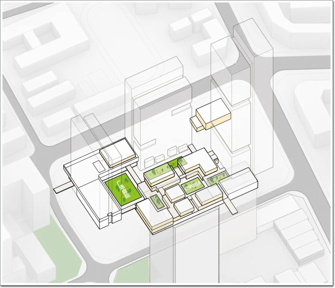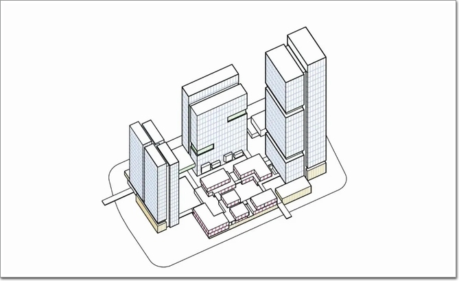 更新組團(tuán):考慮四塊場(chǎng)地關(guān)系整合——中心綠地、高塔落位、城市界面。