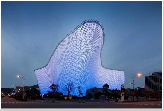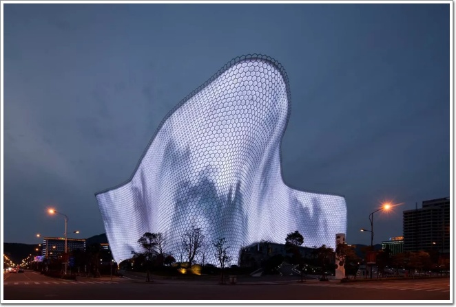 本項目最為特別之處莫過于白色巨網構成的建筑表皮和充滿動感的曲線輪廓,尤其在夜間更是使人產生無盡的遐想,普陀大劇院是夜間的精靈,日間樸實的外表在夜間卻大放光彩,建筑以光為筆,將大劇院外立面變成巨大的畫布,通過具有象征意義的元素將普陀的文化、地域特色進行形象化、符號化的表達:海浪、水波、魚群等元素完美、柔和地展現出海洋文化的精髓,蓮花元素代表著普陀的佛教文化,四季、水墨等元素則體現的是普陀的自然風光,展現出普陀的地理位置所蘊含的獨特氣質。