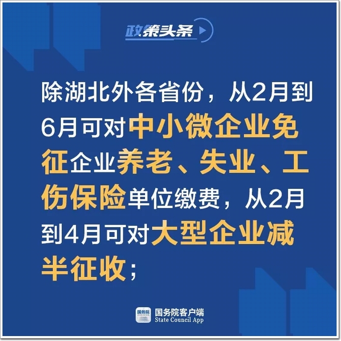 除湖北外各省份,從2月到6月可對中小微企業免征上述三項費用,從2月到4月可對大型企業減半征收。